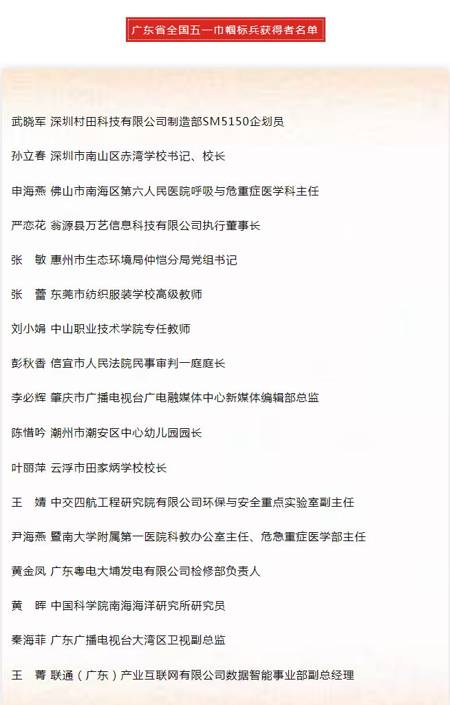 全國先進(jìn)女職工集體和個(gè)人每兩年評(píng)選表彰一次,該評(píng)選活動(dòng)旨在大力弘揚(yáng)勞模精神、勞動(dòng)精神、工匠精神,鼓舞激勵(lì)廣大女職工在強(qiáng)國建設(shè)、民族復(fù)興新征程上更好的發(fā)揮“半邊天”作用。本次評(píng)選表彰中科院共3人、1集體榮獲全國五一巾幗標(biāo)兵、全國五一巾幗標(biāo)兵崗稱號(hào)。廣東省共有17個(gè)集體和17名個(gè)人榮獲全國五一巾幗標(biāo)兵崗、全國五一巾幗標(biāo)兵稱號(hào)。