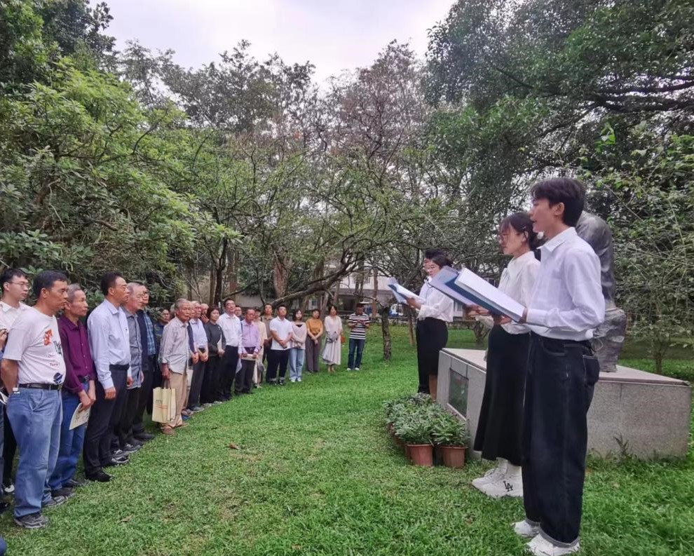 會后,與會同志聚集在陳封懷教授塑像前,4位研究生飽含激情地朗誦了由夏漢平同志創作的詩歌《你是一棵紅棉——‘中國植物園之父’陳封懷教授頌》,表達了對陳封懷的敬仰之情。隨后,魏平、葉清向陳封懷教授塑像獻上鮮花,大家向陳封懷塑像鞠躬敬禮、默哀以表達深深的懷念。大家紛紛表示,陳封懷厚植內心的愛國情懷,敢為人先的創新精神,嚴謹求實、追求真理、默默奉獻的高尚情操,以及集智攻關、團結協作、獎掖后學的育人精神,其所體現出來的高風亮節及高尚情操值得傳承與弘揚。