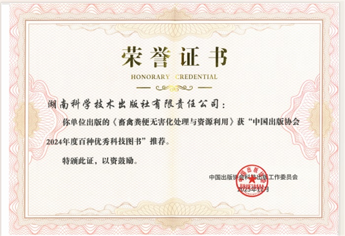 近日,由湖南科學技術出版社策劃組織,印遇龍院士、朱永官院士、譙仕彥院士領銜,聯合董紅敏研究員、李國學教授、董仁杰教授、閆志英研究員、武深樹研究員、楊興明教授、張克強研究員、沈玉君研究員等國內農業環境與畜牧工程領域頂尖專家共同撰寫的《畜禽糞便無害化處理與資源利用》一書,繼入選“2022年國家出版基金優秀項目”后,再獲殊榮,成功入選“2024年百種優秀科技圖書”。